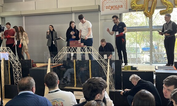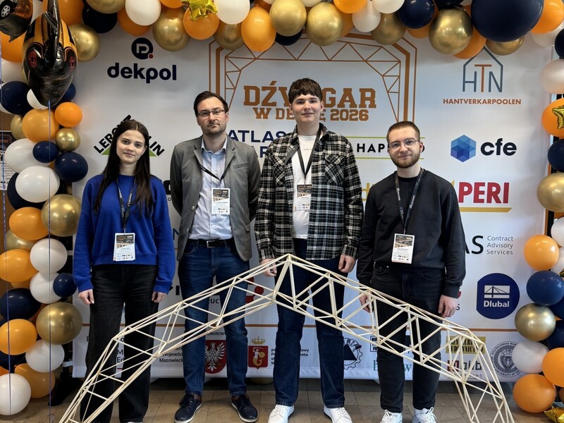 Drużyna „Prowizorka trzyma najdłużej” w składzie: Borys Sokol, Piotr Ryczkowski oraz Tetiana Dubii, reprezentująca Wydział Budownictwa i Architektury Politechniki Lubelskiej, odniosła sukces w ogólnopolskim konkursie „Dźwigar w dechę 2026”, który odbył się 17 kwietnia 2026 roku na Politechnice Warszawskiej.