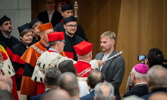 Uroczystość zakończył wykład inauguracyjny dra Jakuba Matusiaka z Wydziału Budownictwa i Architektury PL. Naukowiec zwrócił uwagę, że przyszłość medycyny należy do zespołów interdyscyplinarnych. – Medycyna to gra zespołowa, a drużyna składa się z inżynierów, chemików, biologów, biotechnologów oraz specjalistów IT – mówił badacz. W swoim wystąpieniu zaprezentował przykład takiego podejścia – inteligentny implant kostny. – Ten implant nie powstał w gabinecie lekarskim, powstał przy wspólnym stole chemika, biologa i inżyniera – dodał.