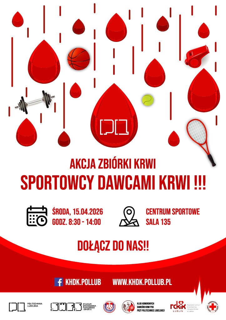 Studium Wychowania Fizycznego i Sportu Politechniki Lubelskiej wraz z Klubem Honorowych Dawców Krwi PCK przy Politechnice Lubelskiej serdecznie zapraszają do udziału w kolejnej, wyjątkowej akcji oddawania krwi pod hasłem „Sportowcy dawcami krwi – dołącz do nas!”.
